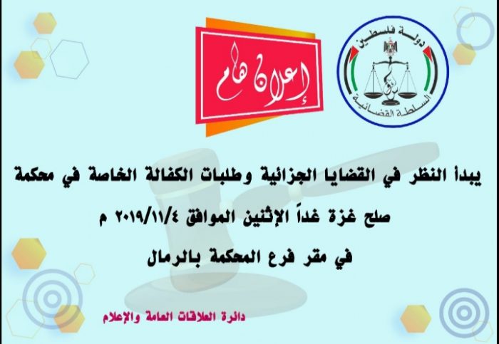 النظر في القضايا الجزائية وطلبات الكفالة في محكمة صلح غزة غداً الإثنين