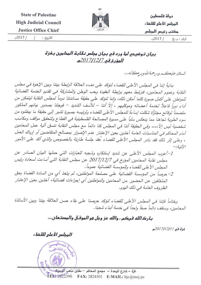 بيان توضيحي لما ورد في بيان مجلس نقابة المحامين بغزة المؤرخ في 07/12/2017 م