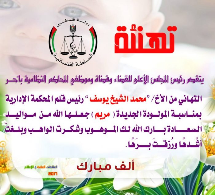 يتقدم رئيس المجلس الأعلى للقضاء وقضاة و موظفي المحاكم النظامية بالتهنئة للأخ/ محمد الشيخ يوسف
