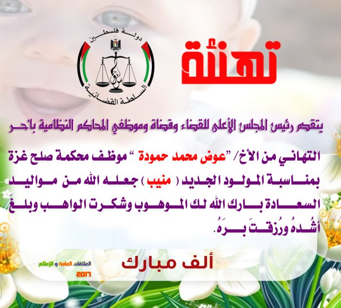 يتقدم رئيس المجلس الأعلى للقضاء وقضاة و موظفي المحاكم النظامية بالتهنئة للأخ/ عوض حمودة