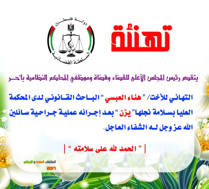 يتقدم رئيس المجلس الأعلى للقضاء وقضاة و موظفي المحاكم النظامية بالتهنئة للأخت/ هناء العبسي