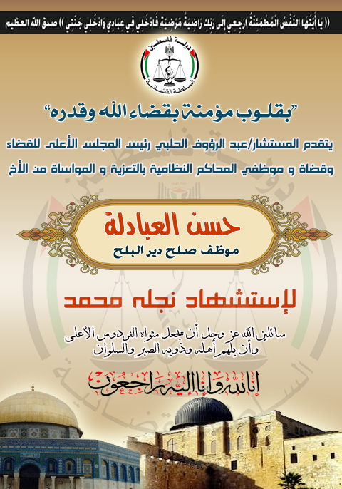يتقدم المستشار/عبد الرؤوف الحلبي رئيس المجلس الأعلى للقضاء وقضاة و موظفي المحاكم النظامية بالتعزية و المواساة من الأخ/ حسن العبادلة موظف صلح رفح لإستشهاد نجلهُ ” محمد ” سائلين الله عز وجل أن يتغمده بواسع رحمته و أن يجعل مثواه جنة الفردوس و أن يلهم أهله الصبر و السلوان , و إنا لله وإنا إليه راجعون.