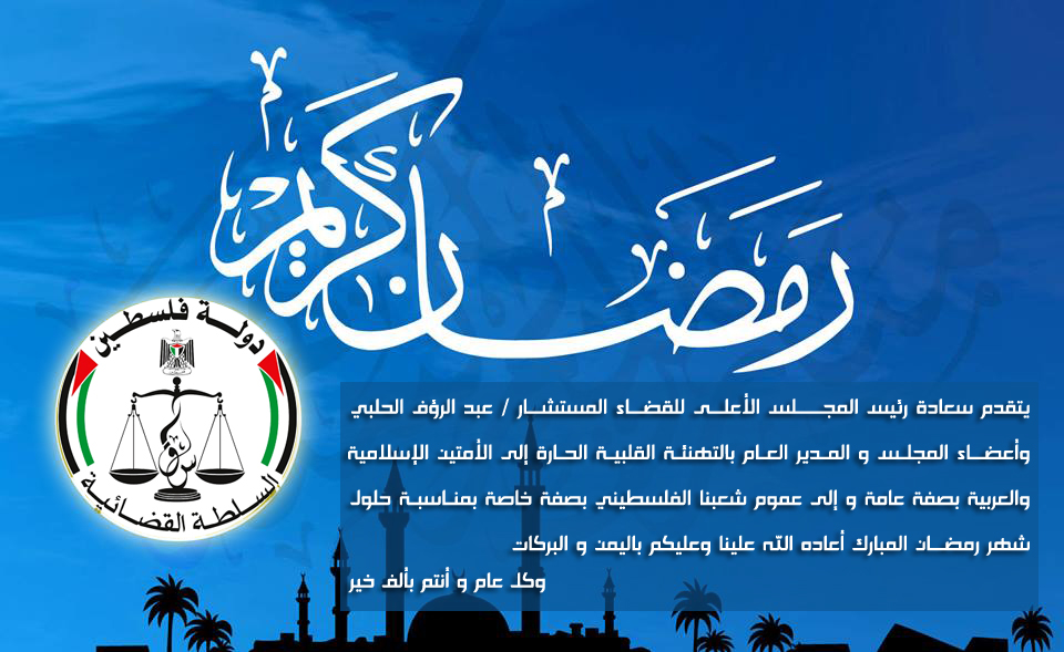 يتقدم سعادة رئيس المجــــلس الأعلــى للقضــاء المستشــار / عبد الرؤف الحلبي وأعضــاء المجلـس و المـدير العـام بالتهنئـة القلبيـة الحـارة إلى الأمتين الإسلامية والعربية بصفة عامة و إلى عموم شعبنا الفلسطيني بصفة خاصة بمنـاسبـة حلول شهر رمضــان المبارك أعاده الله علينا وعليكم باليمن و البركات