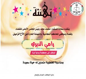 يتقدم سعادة المستشار/ محمد عابد رئيس المجلس الأعلى للقضاء و قضاة و موظفي المحاكم النظامية بالتهنئة الحارة من الأخ الزميل/ رامي الديريالموظف في محكمة بداية غزةبمناسبة الخطوبةمتمنين من الله له حياة سعيدة.دائرة العلاقات العامة و الإعلام
