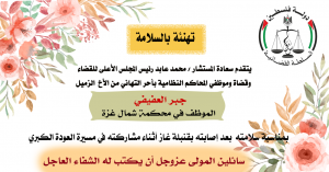 يتقدم المستشار/محمد أحمد عابد رئيس المجلس الأعلى للقضاء وقضاة و موظفي المحاكم النظامية بأحر التهاني من الأخ الزميل/جبر العفيفيالموظف في محكمة شمال غزةبمناسبة سلامته بعد إصابته بقنبلة غاز أثناء مشاركته في مسيرة العودة الكبرىسائلين المولى عز وجل أن يكتب له الشفاء العاجل