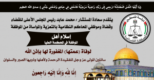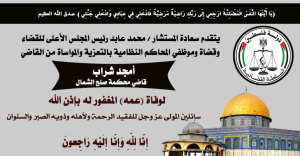 يتقدم المستشار/محمد أحمد عابد رئيس المجلس الأعلى للقضاء وقضاة و موظفي المحاكم النظامية بالتعزية و المواساةمن القاضي/ أمجد شرابقاضي محكمة صلح شمال غزةلوفاة عمه المغفور له بإذن اللهسائلين المولى عز وجل أن يتغمده بواسع رحمته, و أن يجعل مثواه جنة الفردوس، و أن يلهم أهله الصبر و السلوان.و إنا لله وإنا إليه راجعون.