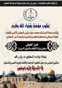 يتقدم المستشار/محمد أحمد عابد رئيس المجلس الأعلى للقضاء وقضاة و موظفي المحاكم النظامية بالتعزية و المواساةمن الدكتور/ حسن الصيفيوكيل وزارة الأوقاف و الشئون لوفاة والده المغفور له بإذن اللهسائلين المولى عز وجل أن يتغمده بواسع رحمته، و أن يجعل مثواه جنة الفردوس، و أن يلهم أهله الصبر و السلوان.و إنا لله وإنا إليه راجعون.