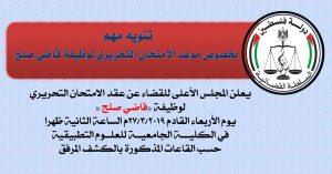 يعلن المجلس الأعلى للقضاء عن عقد الاختبار التحريري لوظيفة قاضي صلح يوم الاربعاء الموافق 27/03/2019 الساعة 2:00 ظهرا في الكلية الجامعية للعلوم التطبيقية بغزة حسب القاعات المذكورة بالكشف المرفق